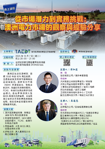 TAEDT 聯盟除了9月12日已舉辦九月份線上論壇「澳洲綠能市場儲能現況與展望」之外,10月7日將繼續舉辦線上論壇「從市場潛力到實務挑戰:澳洲電力市場的觀察與經驗分享」。